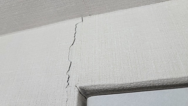 地震だけでなく、道路を走る大型車両の振動などでも建物は常に微細に動いています。また、木材が乾燥して収縮することも下地の動きの一因です。こうした動きに壁紙が追従できず、ひび割れが生じるケースがあります。特に壁の角やドア・窓の周囲、パーテーションとの境目など、力が集中しやすい箇所で発生しやすい傾向にあります。