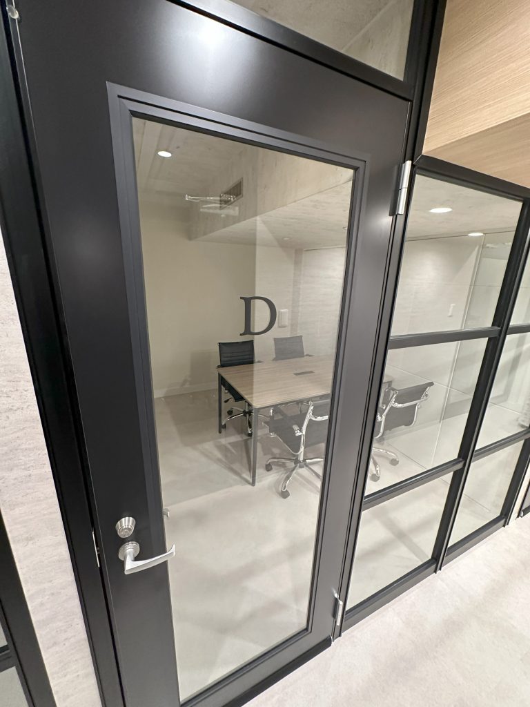 会議室はガラスパーテーションで仕切られており、視線の抜けによって圧迫感を軽減し、開放的な雰囲気を演出しています。ただし、ガラスは音が漏れやすい特性があるため、周囲には吸音パネルを設置し、音漏れや反響を最小限に抑える工夫を施しています。視覚的な開放感と音環境の快適さを両立させた設計となっています。
